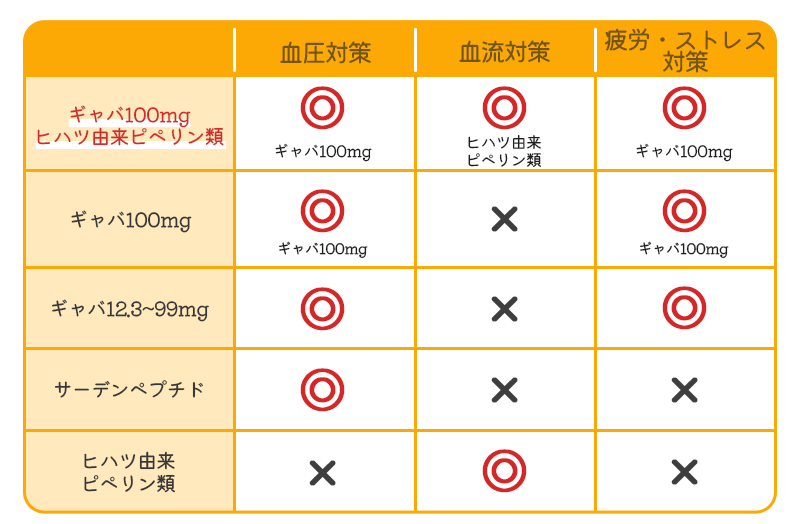 見比べてみると、血圧、血流、ストレス疲労の全てに着目できるのは、主成分が唯一ギャバ100mg&ヒハツ由来ピペリン類であるヒハツ&ギャバの恵みだけという結果になりました。